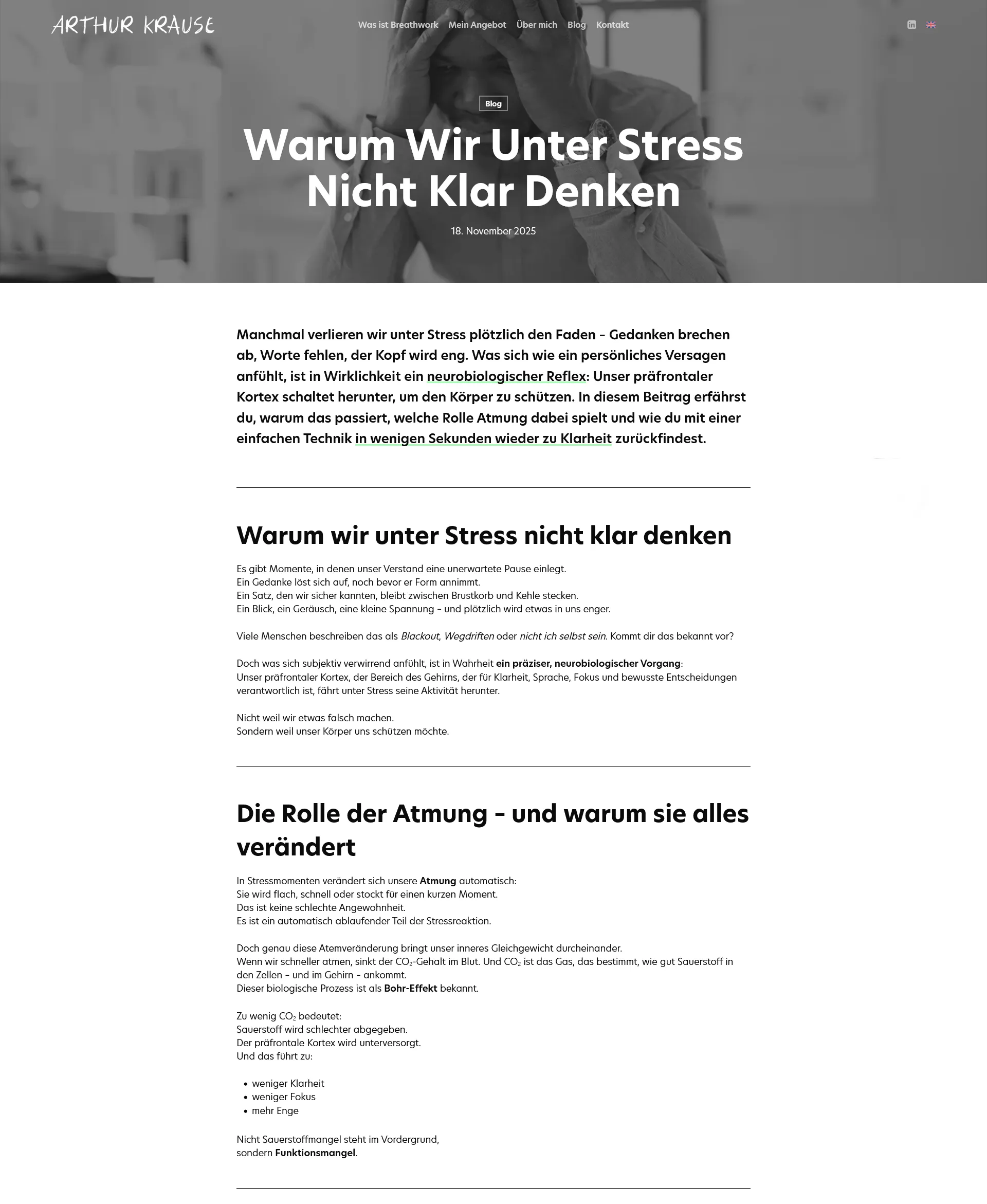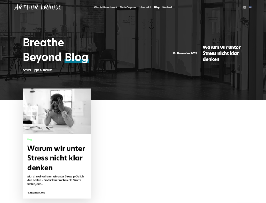 Für den Kunden Arthur Krause haben wir einen zweisprachigen Onepager realisiert, der sich bewusst vom klassischen Breathwork-Look abhebt. Mit einem modernen, jungen Design setzt die Seite starke visuelle Akzente. Neben dem Onepager bietet die Website eine Blogsektion für aktuelle Themen und Inhalte.