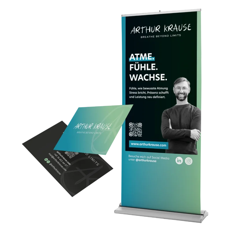 Auch im Bereich Grafikdesign haben wir Arthur Krause begleitet – mit der Gestaltung von Visitenkarten sowie eines Roll-ups für Veranstaltungen. Ziel war ein durchgängig stimmiges Erscheinungsbild, das sich klar von anderen abhebt und ihn professionell und wiedererkennbar präsentiert.